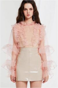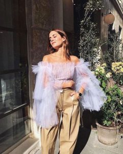 Jako pierwszy przedstawiam trend, którymi są między innymi ciekawe bluzki i koszule. Pojawiają się dekolty karo, barokowy przepych osadzony w klimacie disco i subtelne przezroczystości, które skradły moje serce, efektowne detale, czyli wydłużone w szpic kołnierze koszul , fantazyjne wiązania przy dekolcie, bufiaste rękawy oraz falbany.